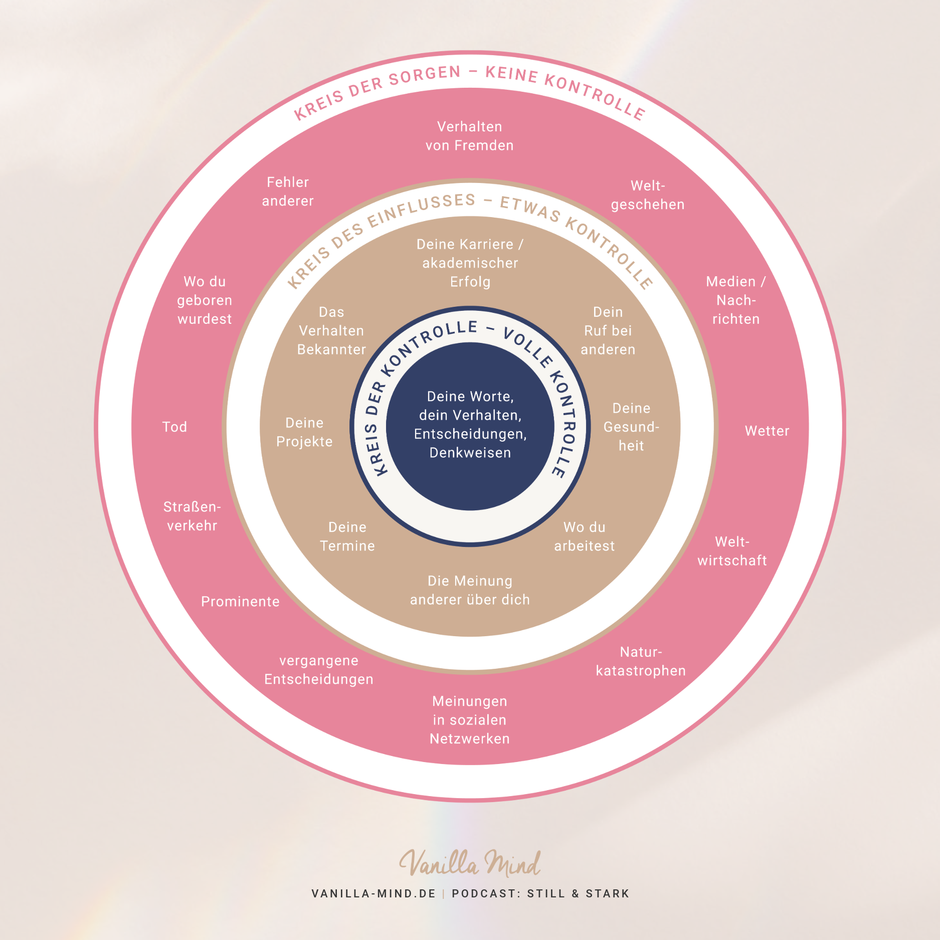 Kreis der Besorgnis: Externe Themen, die dich zwar beschäftigen, aber außerhalb deiner Kontrolle liegen, wie globale Ereignisse, das Wetter, die Gedanken anderer oder die Vergangenheit.